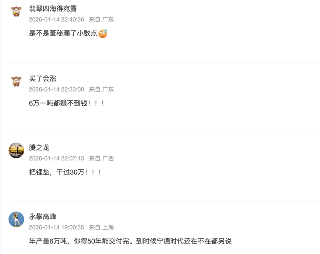 不少投资者也觉得这一订单金额过于离谱。有投资者表示“是不是董秘漏了小数点?”有投资者质疑,“年产量6万吨,你得50年能交付完。到时候宁德时代还在不在都另说。”“这是在搞笑吗?1200亿合同都能估算得出,这不是1200块啊。”还有投资者表示,“炒股这么多年,第一次见这种事。”“扇贝也没敢跑这么多!!!”