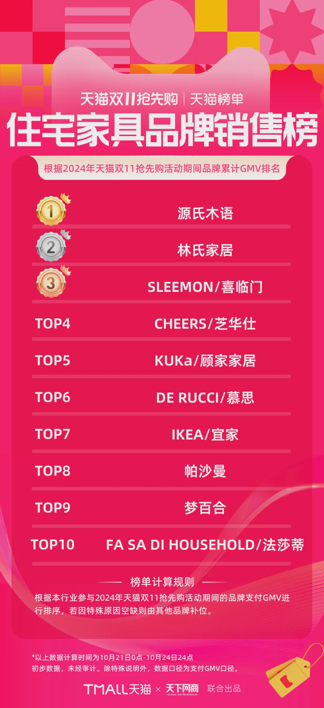 2024年双11,天猫住宅家具销量前三名为源氏木语、林氏家居、喜临门,宜家仅排第七。