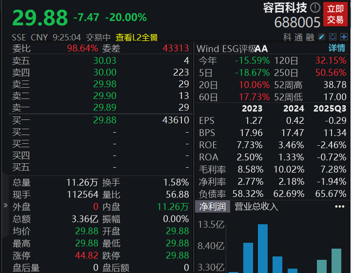 个股方面,容百科技竞价20cm跌停,消息面上,公司公告,因重大合同公告涉嫌误导性陈述等被证监会立案调查。容百科技回复问询函时称,“1200亿元合同总金额”为估算,最终销售具不确定性。