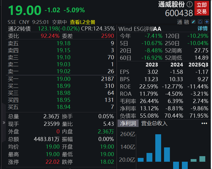 通威股份低开超5%,公司预计2025年净亏损约90亿元至100亿元。