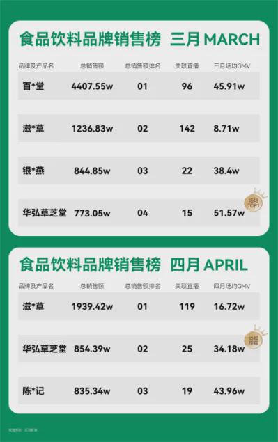 ▲2025年3至4月视频号食品饮料品牌销售榜 来源:华弘草芝堂官方数据