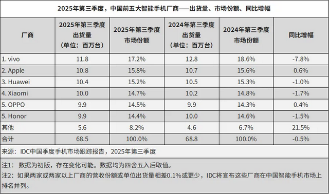 IDC的数据最能说明问题:2025年,vivo全年出货量同比跌了6.6%,是前五名里跌得最狠的;小米虽然全年微增4.3%,但第四季度直接暴跌18%,比华为跌幅还大;OPPO全年微增2.1%,变化不大。