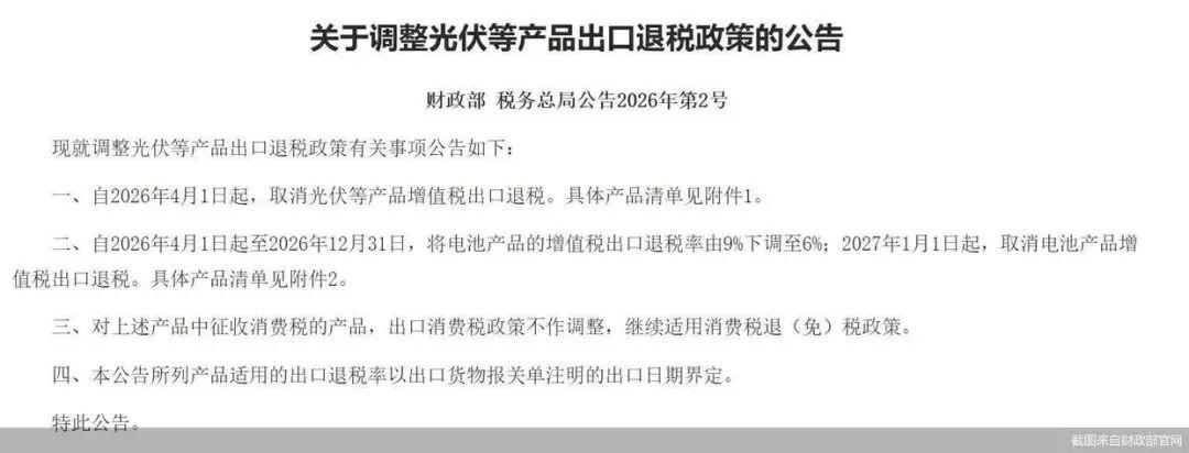那就是,4月1号起,全面取消光伏等产品增值税出口退税。
