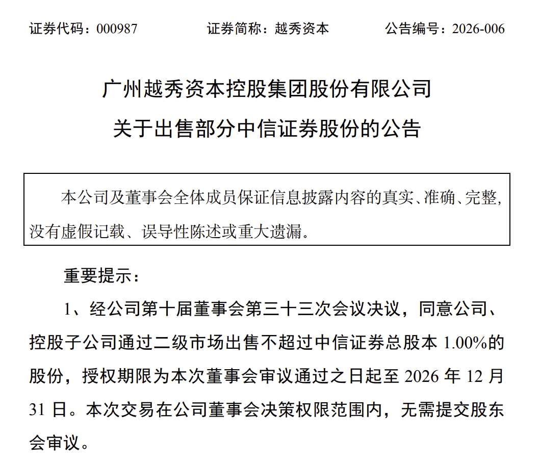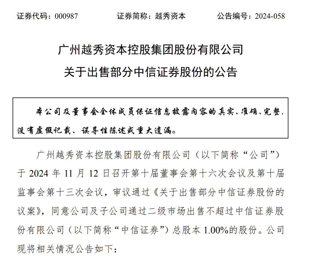 2024年11月,越秀资本发布《关于出售部分中信证券股份的公告》显示,公司在于2024年11月12日召开的董事会会议上审议通过《关于出售部分中信证券股份的议案》,同意公司及子公司通过二级市场出售不超过中信证券总股本1.00%的股份。授权期限至2025年12月31日。