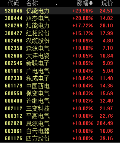 具体来看,电网设备股再度爆发,中国西电、积成电子、思源电气等逾20股涨停。