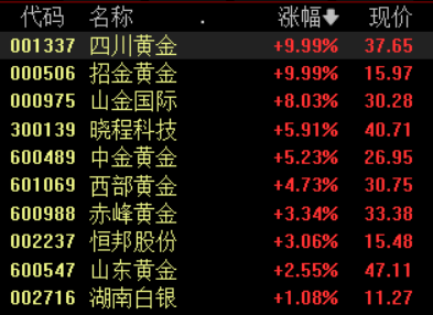 黄金股集体走强,四川黄金、招金黄金涨停。