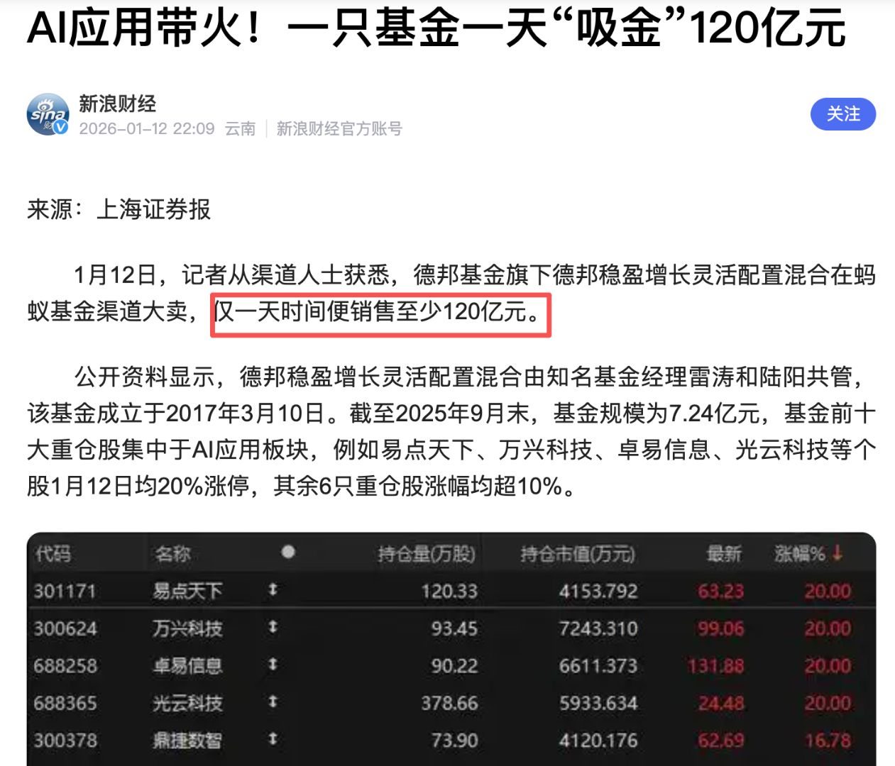 2026年1月12日,A股AI应用方向全线爆发,德邦稳盈增长A/C当天的回报率分别达到8.32%、8.31%。这一数字本已亮眼,但更引人注目的是一则媒体报道——该基金仅在蚂蚁基金渠道就大卖了至少120亿元。