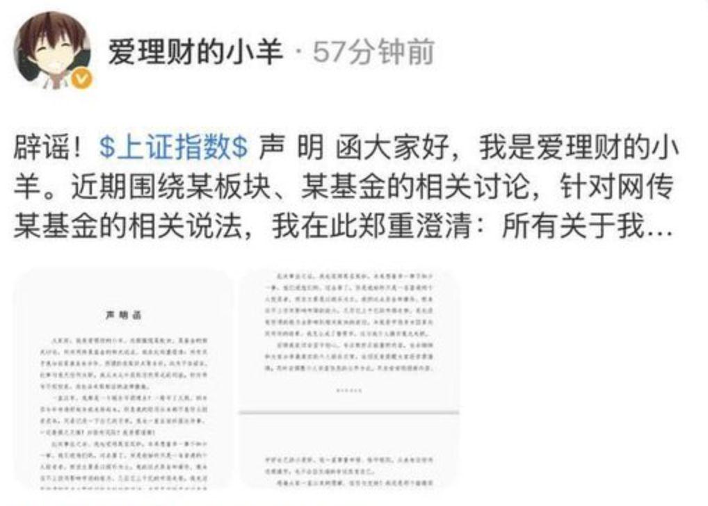 1月17日,“爱理财的小羊”在蚂蚁基金发布声明函表示,所有关于他与某基金有合作,所谓的收取返点等言论,均为不实谣言,自己会调整个人实盘信息的公开方式。