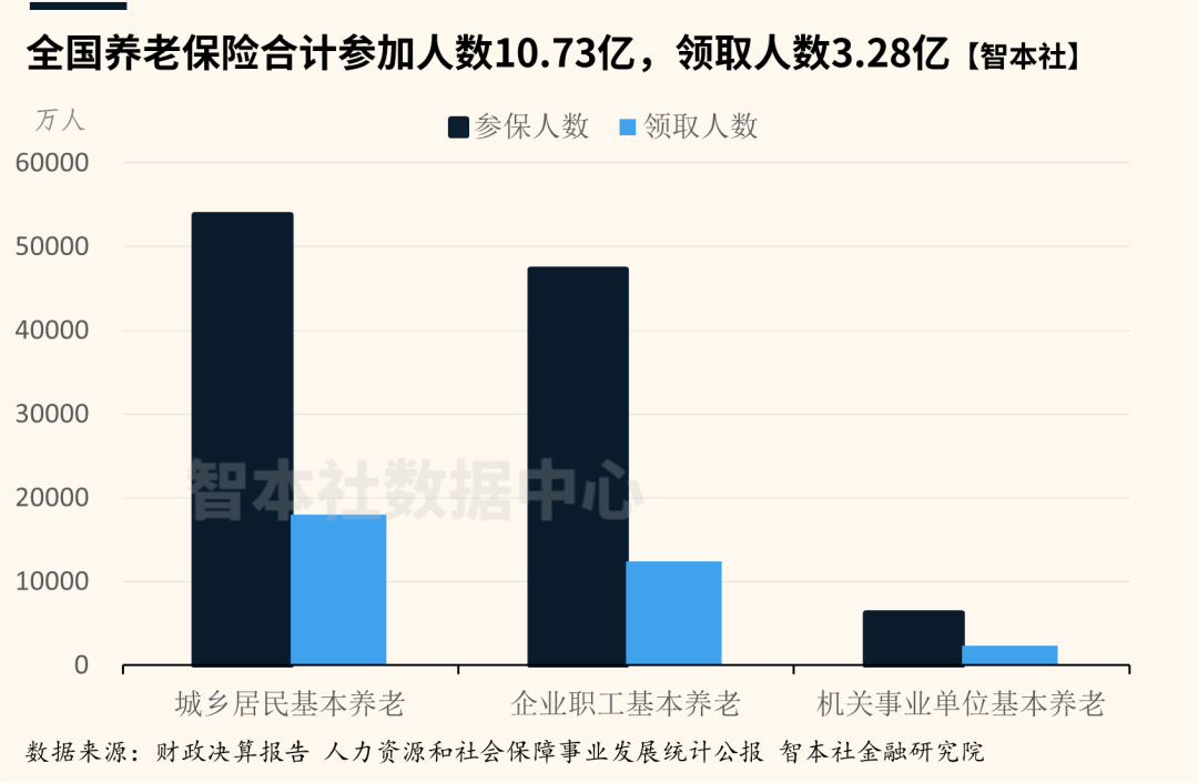 根据智本社数据中心的统计,截至2024年底,全国基本养老保险参保人数为10.73亿人(新增639万人)。其中: