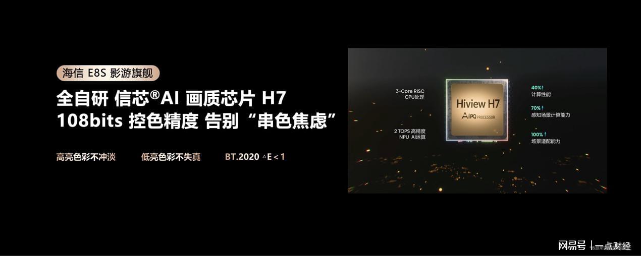控光精度上,海信E8S搭载全球首款基于RISC-V开放架构的信芯AI画质芯片H7,首创三维光色同控技术,毫秒级同步调控三原色光的强度与配比,支持3x10240级精准分区控制,1个彩色分区的控制精度超越传统3个控光分区;最高配备9360个控光控色分区,配合108bits控色精度,色准ΔE<1,达到专业显示器级别,满足影视创作、高端游戏等严苛场景需求。