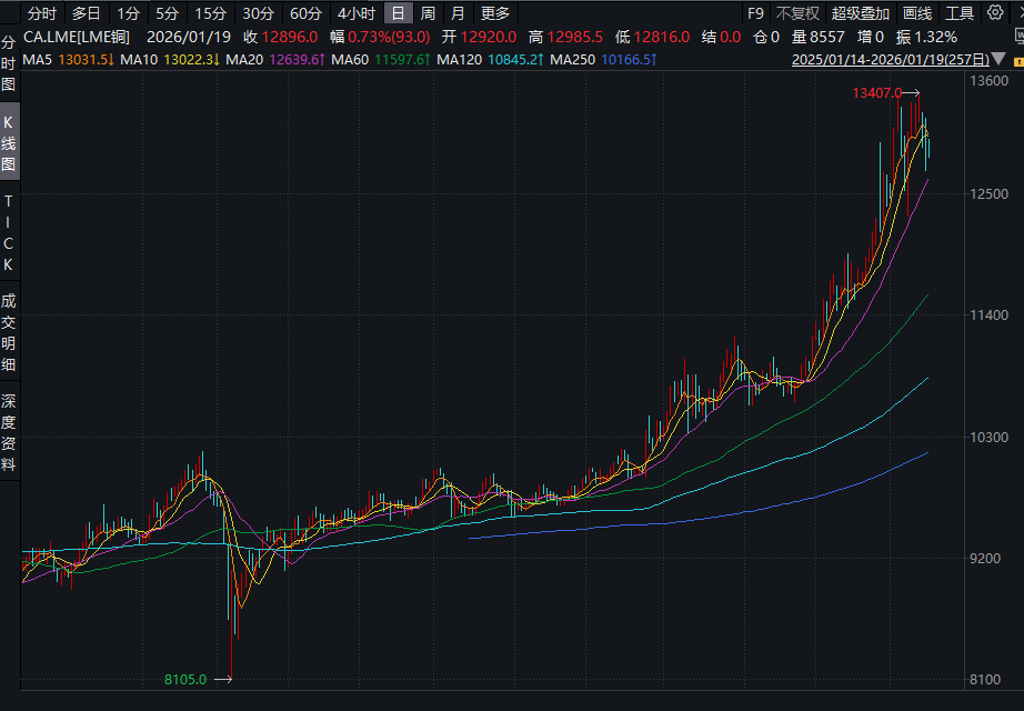投资铜条兴起的背后是贵金属价格的上涨。2026年以来,铜价延续上涨行情,1月14日,LME铜一度涨至每吨13407美元,创历史新高,随后出现波动回调,截至1月19日18时10分,LME铜每吨为12896美元。