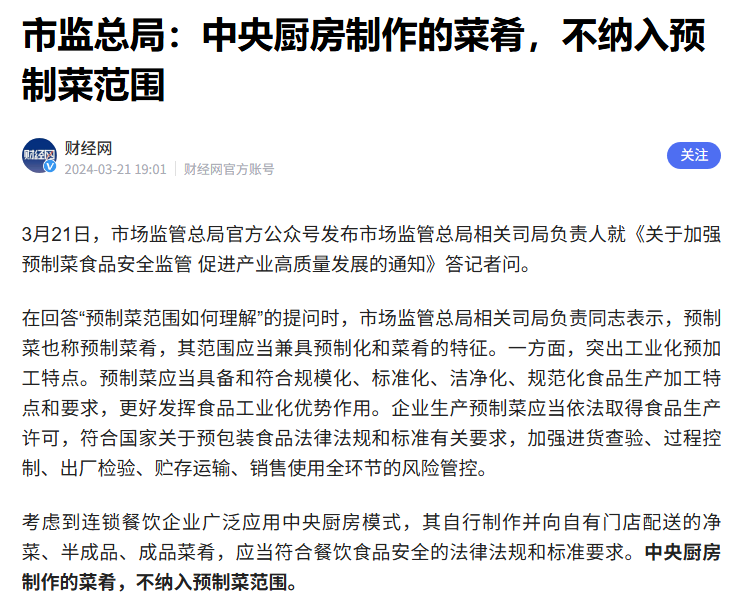他所谓的国家标准,是2024年出台的一份文件,里面明确规定了,预制菜是工业化预加工的预包装菜肴,连锁餐饮中央厨房给自家门店配送的菜品,不纳入预制菜的范围。