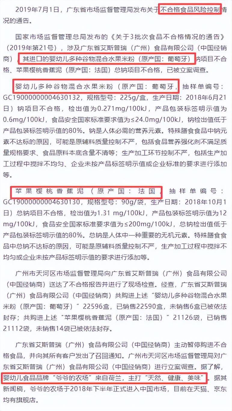 实际上,爷爷的农场在增长过程中已多次遭受通报处罚。自产品上市销售以来,该品牌多次被各级监管部门检出不合格,问题涵盖碘、钠、钙、泛酸等关键营养指标不达标,涉及米粉、果泥等核心婴幼儿辅食品类。2019 - 2021年间,国家市场监督管理总局、广东省市场监督管理局、海关总署等先后通报其产品存在质量问题。