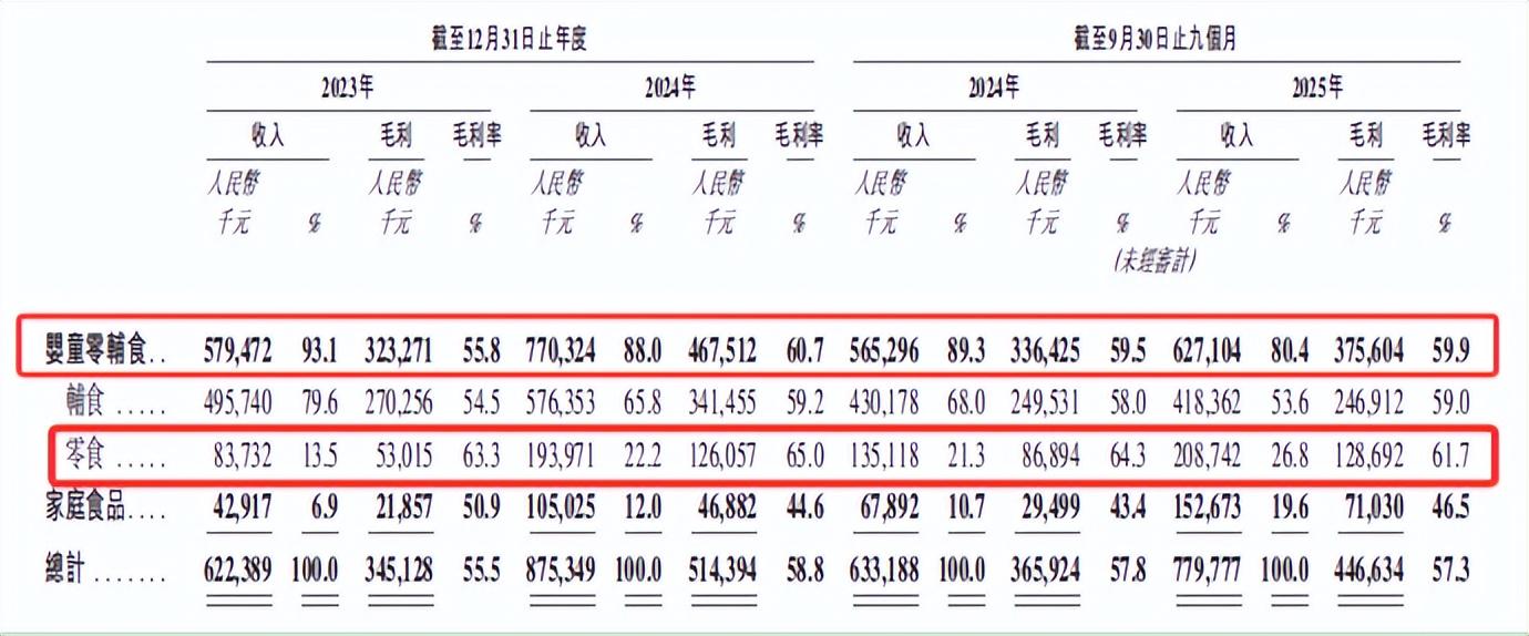 产品结构上,婴童零辅食仍为核心支柱。报告期内,该板块占收入比分别为93.1%、88%、80.4%。平均售价从2023年24.4元/份、23元/份、21.8元/份。主要原因为低价零食类占比分别为13.5%、22.2%、 26.8%,拉低了整体盈利水平。而家庭食品板块收入占比虽提升,但毛利率低,难形成有效利润支撑。