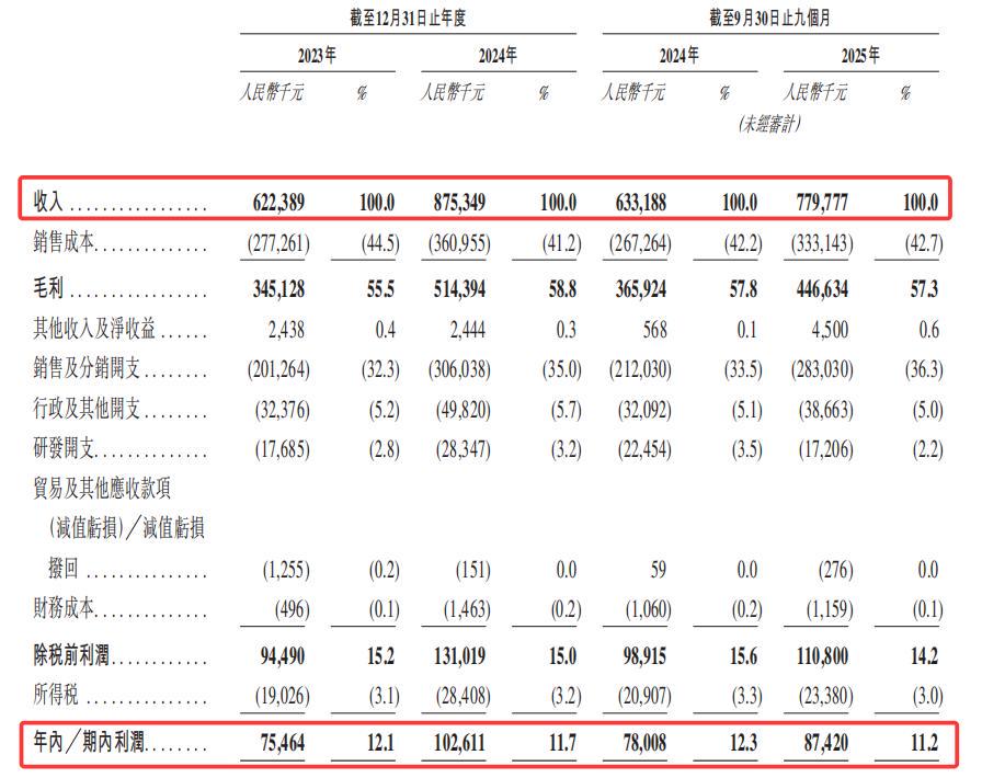 利润端虽净利润同步增长,分别为7546.4万元、1.03亿元、8742万元,但盈利效率却持续承压。各期毛利率分别为55.5%、58.8%、57.3%,净利润率分别为12.1%、11.7%、11.2%。呈现出“高毛利率、低净利率”的特征。