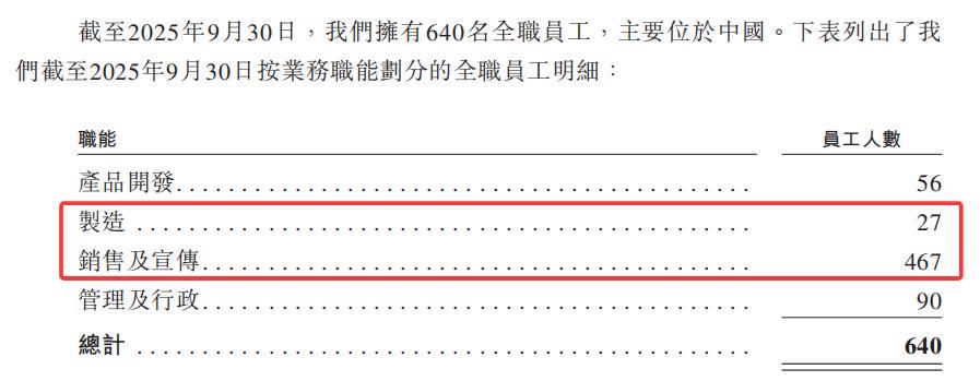 截至2025年9月30日,公司640名全职员工中,制造环节员工仅27人,生产完全依赖62家OEM制造商,自有工厂于2025年10月才实现小规模投产,品控把控能力极弱。