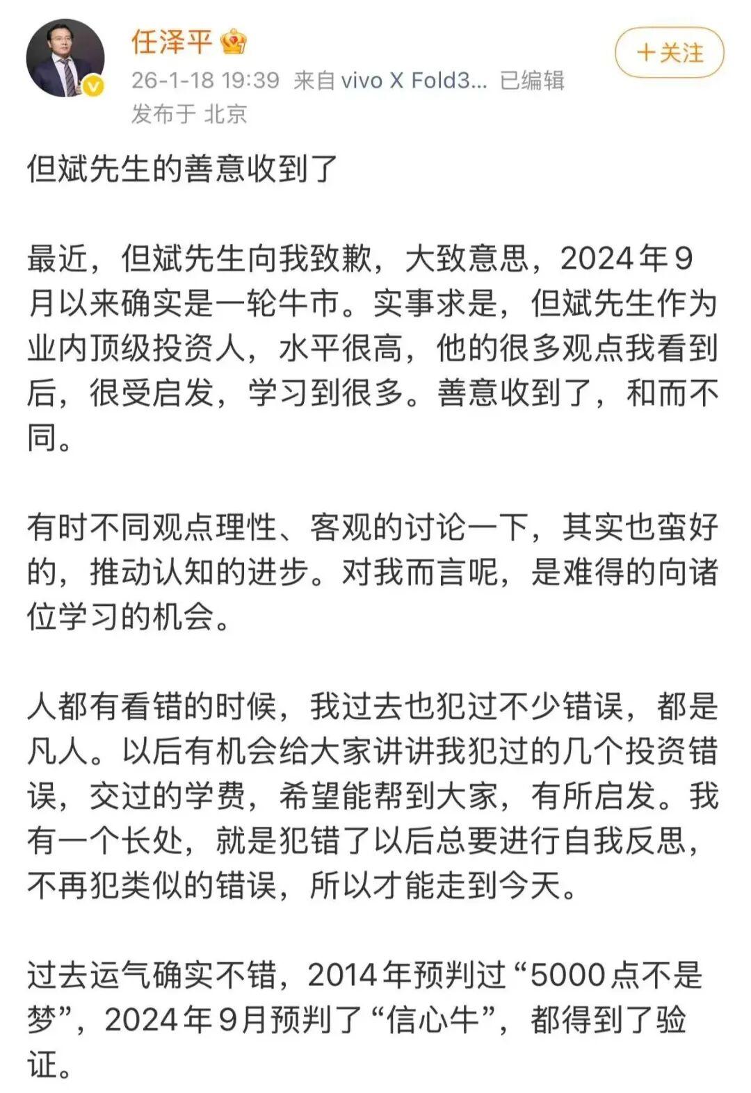 红星资本局1月19日消息,网红经济学家任泽平昨晚在社交媒体上发文,公开回应私募大佬、东方港湾董事长但斌的致歉,为此前的市场“多空”之争画上句号。
