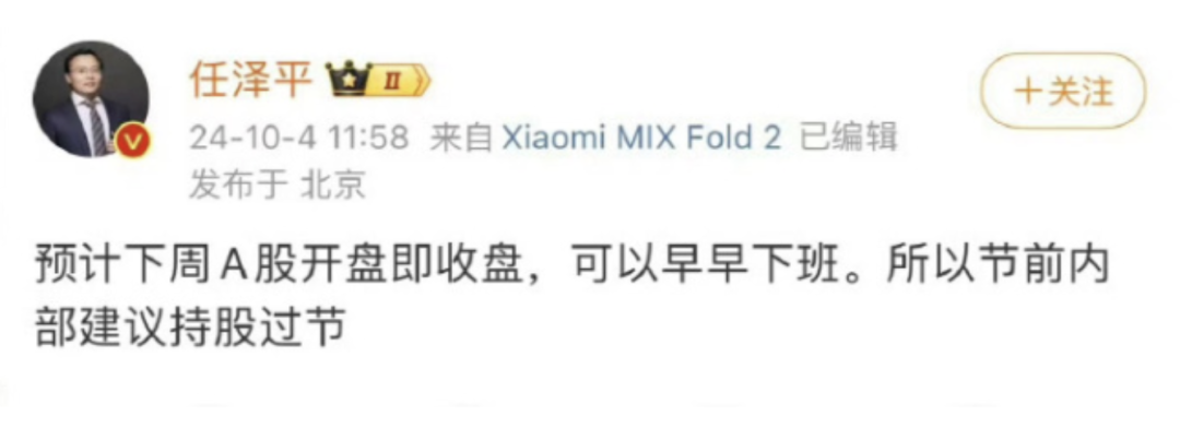 不同于但斌,任泽平对股市颇为乐观,同年10月4日,他发微博称:“预计A股开盘即收盘,可以早早下班。所以节前内部建议持股过节。”