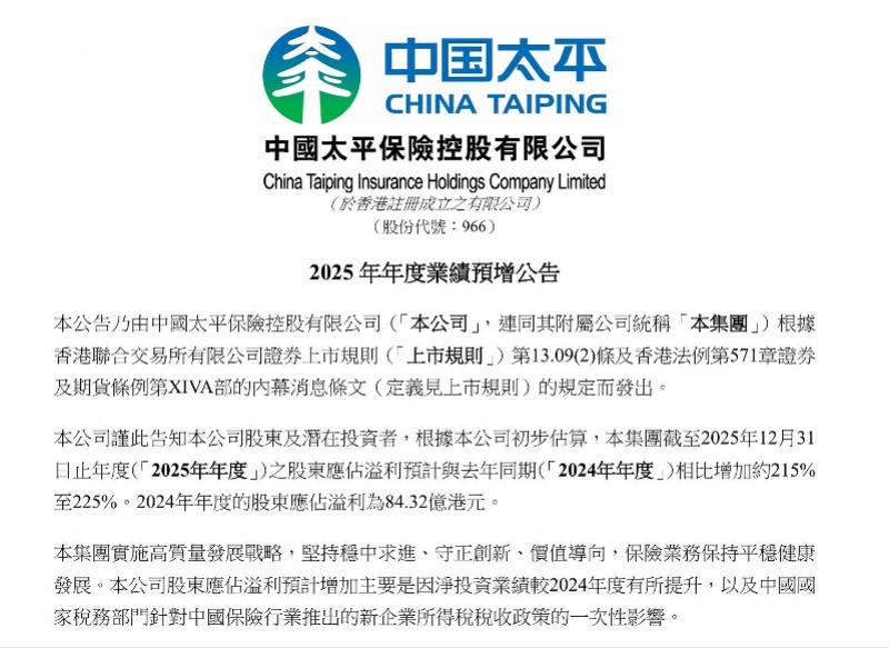 中国太平表示,本次业绩大幅预增主要得益于两大因素:一是净投资业绩较2024年实现稳步提升;二是国家税务部门针对保险行业出台的新企业所得税政策产生一次性积极影响。