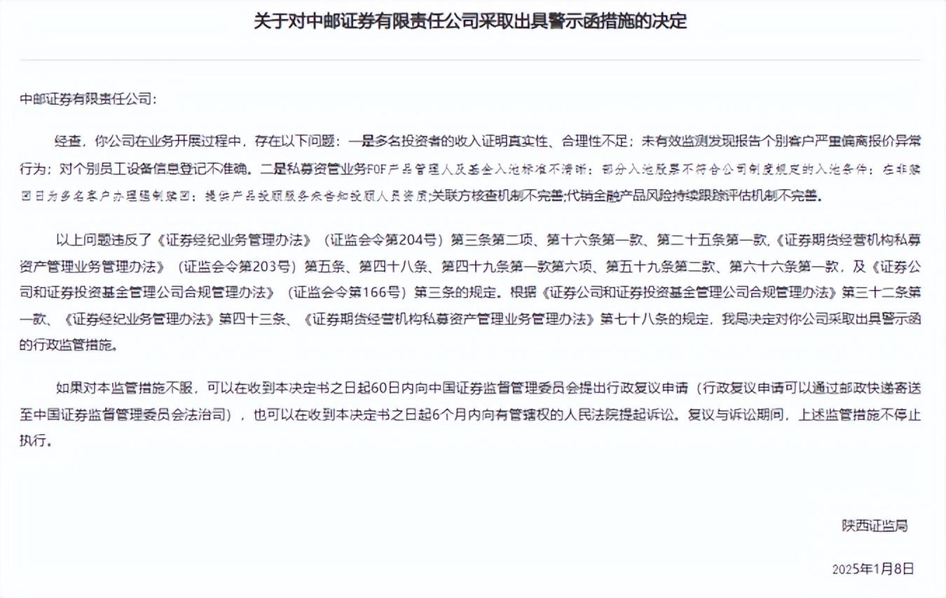 2025年1月8日,陕西证监局开出该省年度首份券商监管罚单(陕证监措施字〔2025〕1号),直指中邮证券多项业务违规。