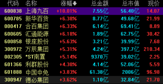1月20日,零售板块盘中冲高,上海九百涨停,新华百货一度涨停,合百集团、汇通能源涨超6%,万辰集团、中国中免、广百股份等跟涨。