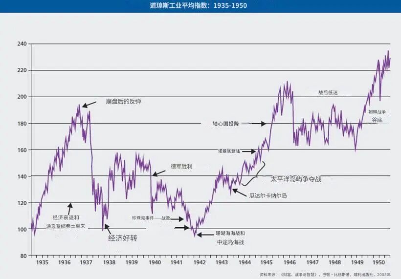 二战期间美国股市的走势也印证了“国运”对资本市场的关键性影响。二战爆发之初,在大西洋和太平洋的护佑下,美国坐山观虎斗,大发战争财,向交战双方出售战略物资,经济好转、公司利润上升。但是,股市却一路走低。原因是,德国和日本取得节节胜利,尤其是日本偷袭珍珠港重创美国海军。此时,投资者对“美国国运”开始担心。股市转折点出现在1942年中途岛海战,日军损失4艘航母、250架舰载机;美军损失1艘航空母舰、150架飞机。日本海军失去开战以来的战略主导权,在第二次世界大战中渐走下坡。1943年斯大林格勒战役、1944年诺曼底登陆、1945年日本和德国投降,进一步推升了股市。
