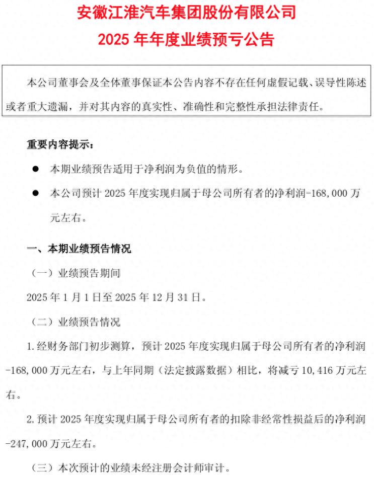 1月17日,安徽江淮汽车集团股份有限公司(下称“江淮汽车”)发布2025年年度业绩预亏公告。