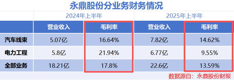 作为永鼎股份营收的两大主力军,2025年上半年汽车线束与电力工程两大业务合计占比超64%,但其盈利能力持续承压,成为拖累主业净利润的核心因素。