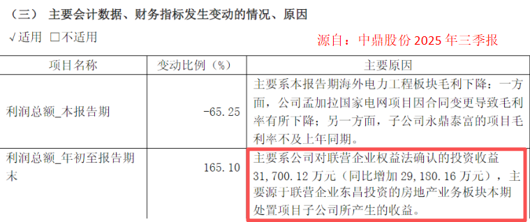 深究就会发现,中鼎股份2025年前三季度3.29亿元的净利润中,有3.18亿元来自投资收益,且大部分是联营公司东昌投资处置房地产子公司带来的一次性收益。