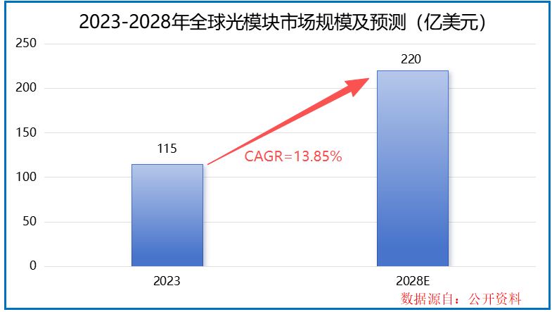 先看向光通信领域,在AI算力爆发与5G网络升级的双重驱动下,作为光通信核心器件的光模块市场需求快速增长,预计到2028年全球光模块市场规模有望突破220亿美元。
