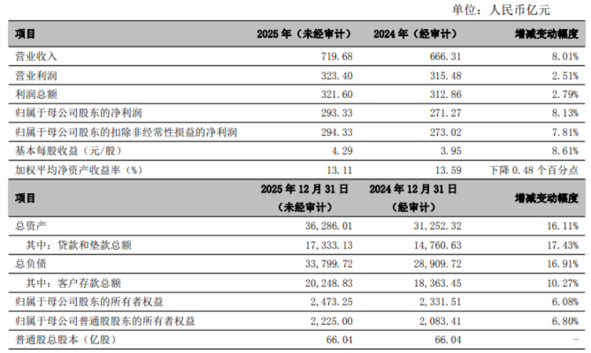 财务数据显示,2025年,宁波银行总收入达到719.68亿元,相比去年同期增长了8.01%;归母净利润达293.33亿元,同比增长8.13%;加权平均净资产收益率为13.11%,同比下降0.48个百分点。
