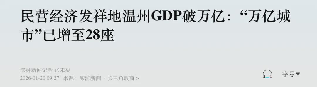 2025年,温州地区生产总值突破万亿元大关,排名前移至全国第28位、重返地级市10强行列。