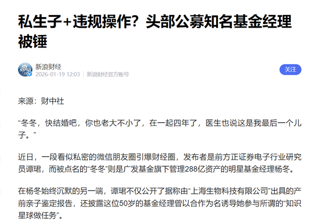 2026年1月中旬,一则朋友圈产前亲子鉴定报告截图,将广发基金管理有限公司(下称“广发基金”)总经理助理、基金经理杨冬推到了风口浪尖。