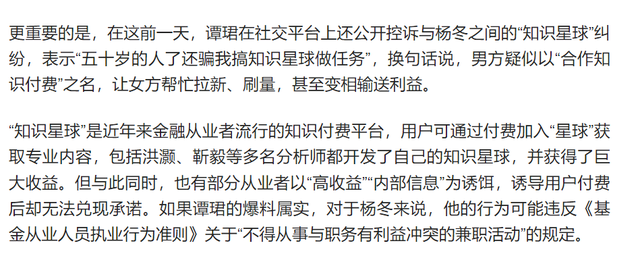 而风波并未止步于情感纠葛。另据新媒体“财中社”报道,她还披露广发基金杨冬曾以合作为名诱导她参与所谓的“知识星球做任务”。