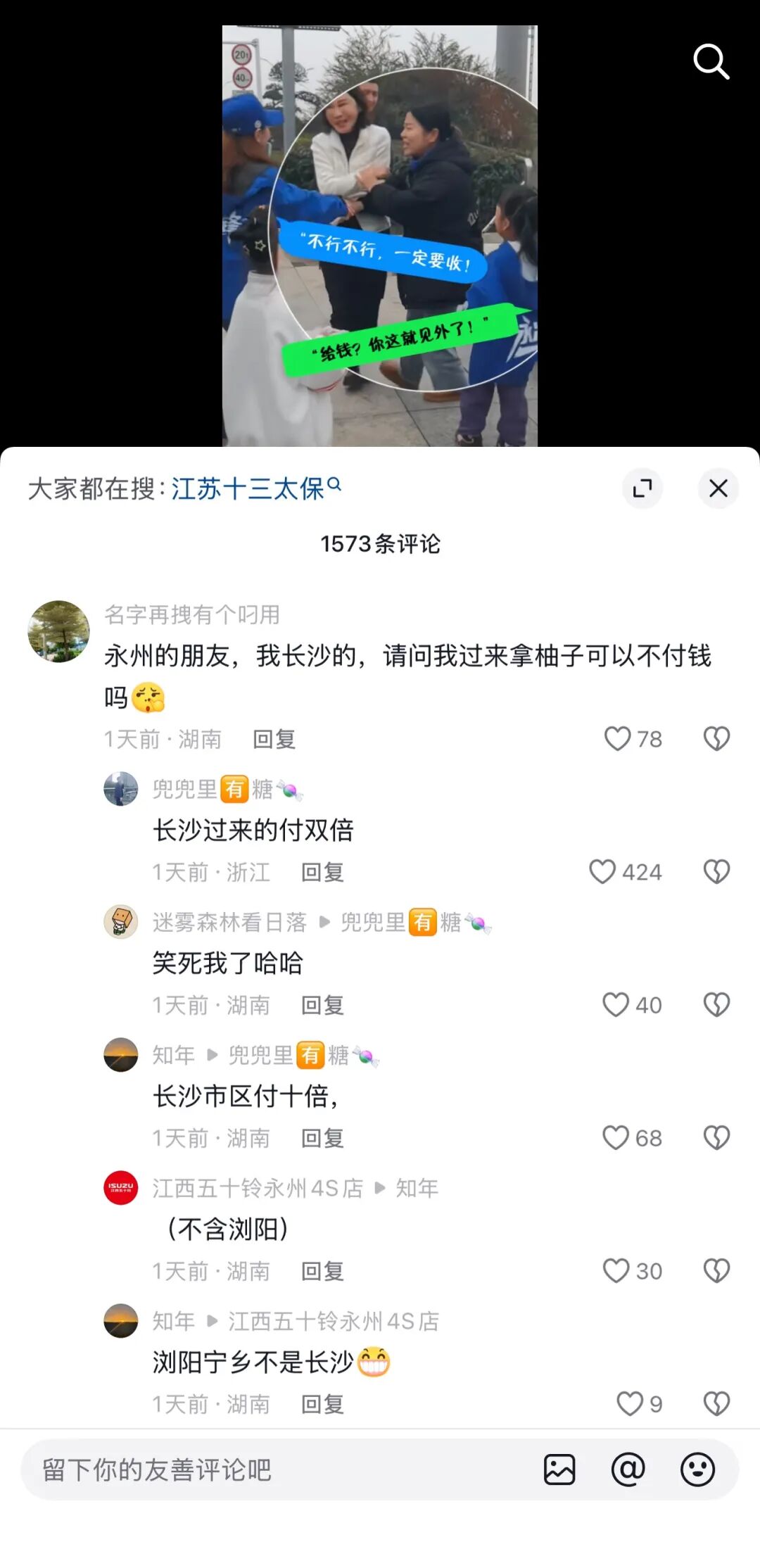大家搞得这么热闹,引来了长沙的网友,他们看到永州市民在给来玩的江苏网友免费发水果,问自己来了能不能也免费,结果永州朋友们说你们来了要双倍价格。