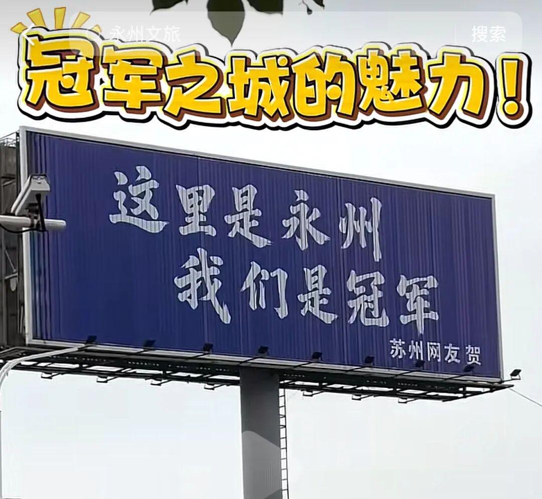 网友们真是喜欢这种“开局一个碗,结局一座杯”的队伍。他们夺冠后一周,永州宋家洲大桥桥头,一处长18米、宽6米的“高炮广告位”,被苏州网友封全昌自费一万元包下写上了“这里是永州 我们是冠军”。
