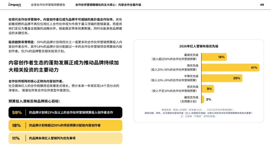 据impact.com《全球合作伙伴营销洞察报告》,59%的品牌计划将四分之一或更多的合作伙伴营销预算投入内容创作者合作,其中18%的品牌计划分配超过一半的合作伙伴营销项目预算给内容创作者。