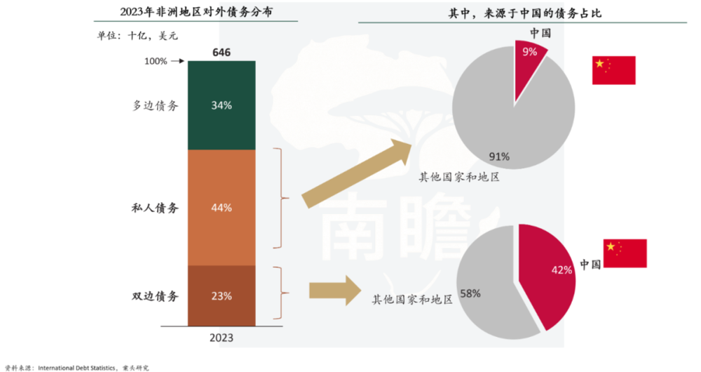 从2023 年数据看,非洲地区约三分之一外债来自多边机构,四成多来自私人债务,双边官方债务不到四分之一。也就是说,真正金额最大的“债主”,其实是全球资本市场和各类投资机构,而不是某一个国家。