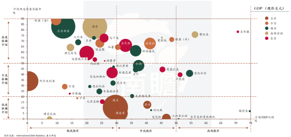 每一个气泡的大小代表该国的GDP体量。尼日利亚、南非、埃及、阿尔及利亚等,气泡明显比其他国家大。这说明即便债务有压力,这些国家依然是不可忽视的大市场。