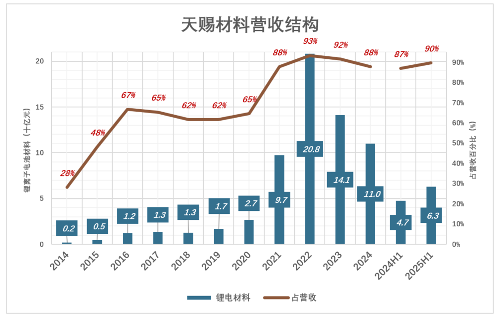 2016年,电池材料收入占比突进到60%以上; …… …… …… 2021年,电池材料收入占比达到90%一线: 2021年,收入97亿、占营收的88%; 2022年,收入208亿、占营收的93%; 2023年,收入141亿、占营收的92%; 2024年,收入110亿、占营收的88%; 2025年H1,收入63亿、占营收的90%;