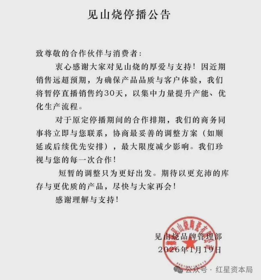 1月19日,李亚鹏带货的茶具品牌“见山烧”发布公告,表示因近期销售远超预期,为确保产品品质与客户体验,将暂停直播销售约30天,以集中力量提升产能、优化生产流程。