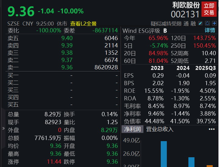 利欧股份复牌一字跌停,公司公告,完成停牌核查,AI相关业务营收占比较小,市场情绪过热。