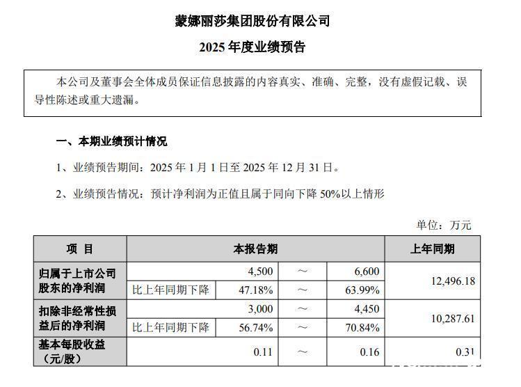 蒙娜丽莎最新发布的2025年度业绩预告显示,预计全年归母净利润为4500万元至6600万元。这一数据与上年同期的12496.18万元相比,下降了47.18%至63.99%,几乎腰斩。扣非净利下降更预计达56.74%至70.84%。