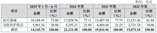 2022年—2024年及2025年上半年,百瑞吉功能性护肤品业务分别实现收入2721.74万元、4409.46万元、5293.21万元和3961.34万元,在主营业务收入中的占比分别为18.06%、22.25%、22.89%和28%,各期毛利率分别为80.32%、72.65%、72.82%和75.34%。