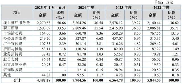 其中第一大投入是线上推广服务费,各期分别为2140.44万元、2578.12万元、3204.26万元和2270.83万元,三年半合计投入1.02亿元,在百瑞吉总销售费用中的占比也从36.62%涨至50.66%,功能性护肤品业务的销售费用率也因此分别高达92.17%、72.63%、77.78%和69.92%。