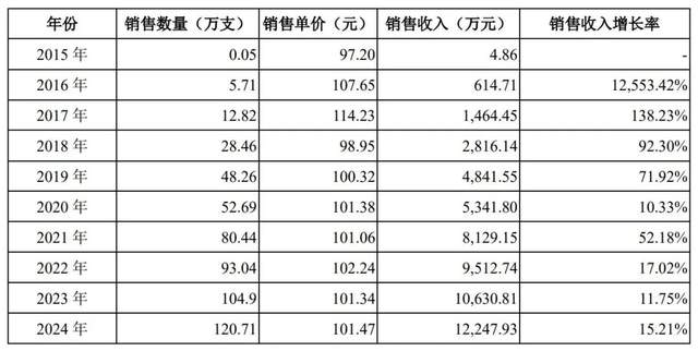 基于此,该产品自上市以来销售数量持续快速增长,各期分别实现销量93.04万支、104.9万支、120.71万支和69.96万支,销售单价则分别为102.24元、101.34元、101.47元和96.54元,总体稳定在100元左右。