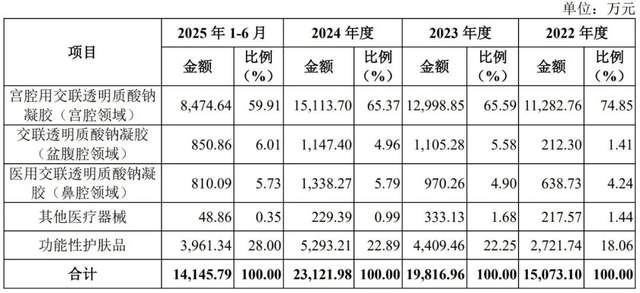 目前,宫腔用交联透明质酸钠凝胶产品是百瑞吉的第一大单品,2022年—2024年及2025年上半年(下称“各期”)分别实现收入1.13亿元、1.3亿元、1.51亿元和0.85亿元,分别占公司主营业务收入的74.85%、65.59%、65.37%和59.91%。尽管近年来占比逐年下降,但仍维持在60%左右。