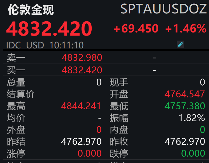 截至2026年1月21日10时左右,伦敦金现报4832.42美元/盎司,日内涨幅超1.4%,盘中最高突破4844美元/盎司,创历史新高;纽约期金同步走强,站上4840美元/盎司,日内涨幅达1.63%。多家机构看涨金价向5000美元关口冲刺,但需注意,短期黄金价格或面临回调风险,投资需理性看待。