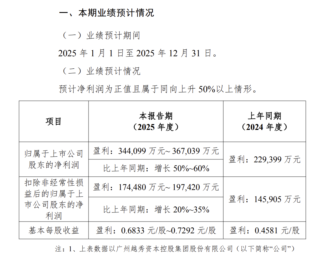 1月20日晚间,越秀资本(000987.SZ)发布2025年度业绩预增公告,预计2025年度归属于上市公司股东的净利润为约34.41亿元至36.70亿元,同比增长50%至60%,上年度为盈利约22.94亿元。