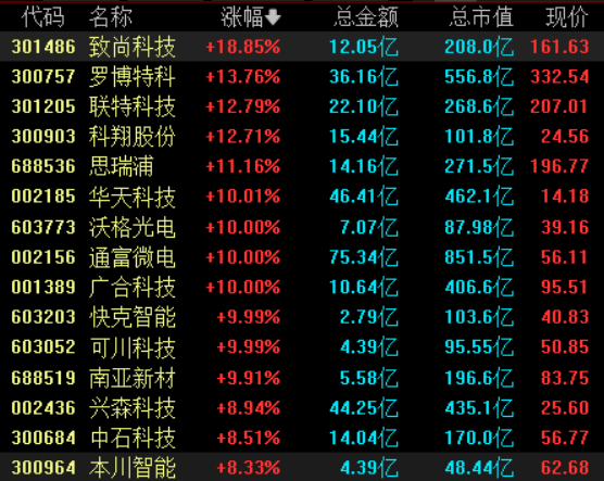 华天科技、沃格光电、通富微电、广合科技、可川科技等涨停,致尚科技涨18%,罗博特科、联特科技等多股涨超10%。